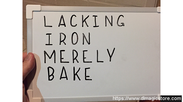 Without asking a single question, the performer quickly rattles off several details about the word: "I'm getting nothing. Maybe that's the point. I'm sensing an absence, something missing…" He writes a word on a white board or pad. He asks the spectator to name her word: "Lacking". The performer shows his board: he has written "Lacking".